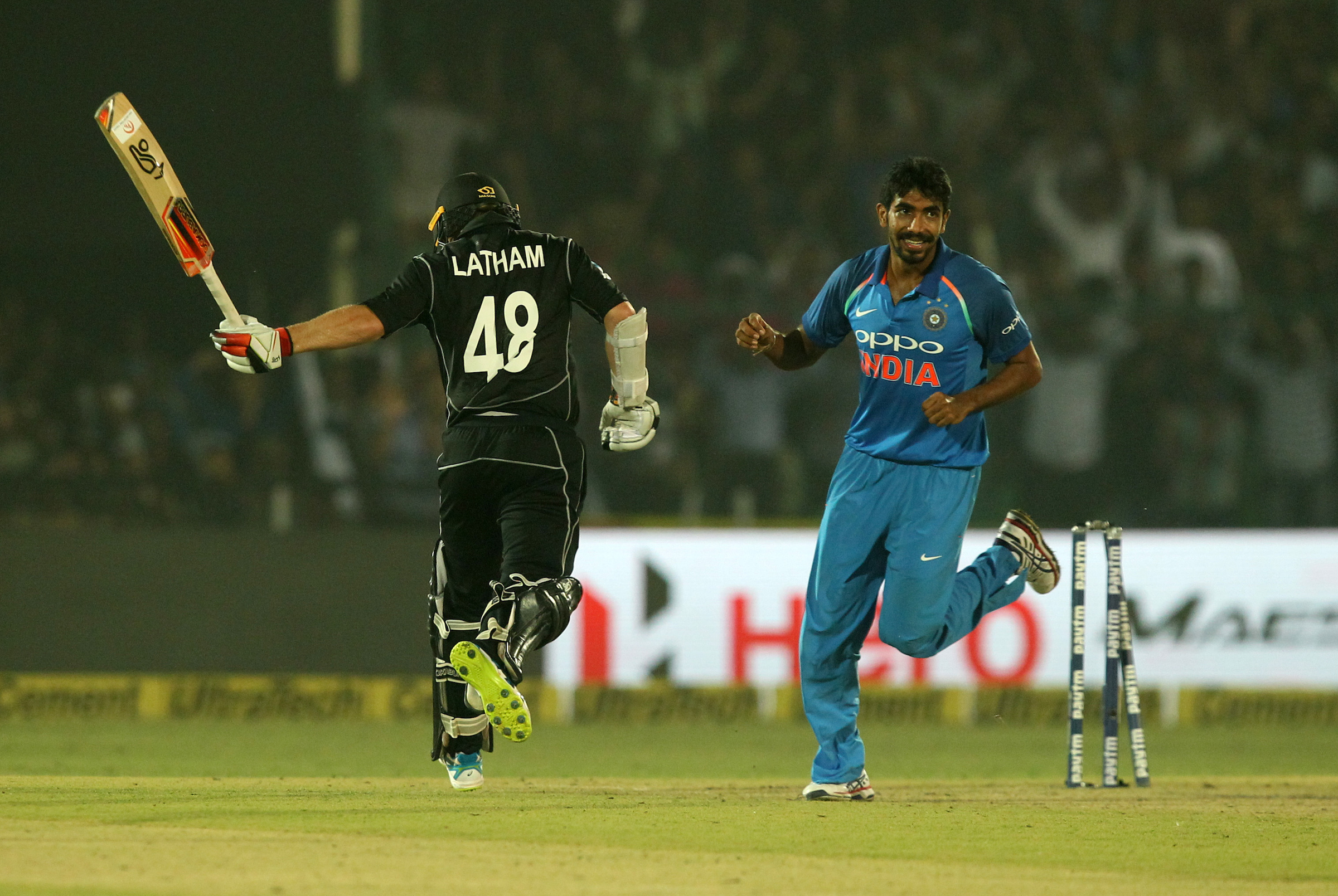 Some superb bowling by Jasprit Bumrah brings India back into it! Latham run-out for 65. Santner belts a SIX first ball! 18 needed from 10! pic.twitter.com/hkVidodwsP