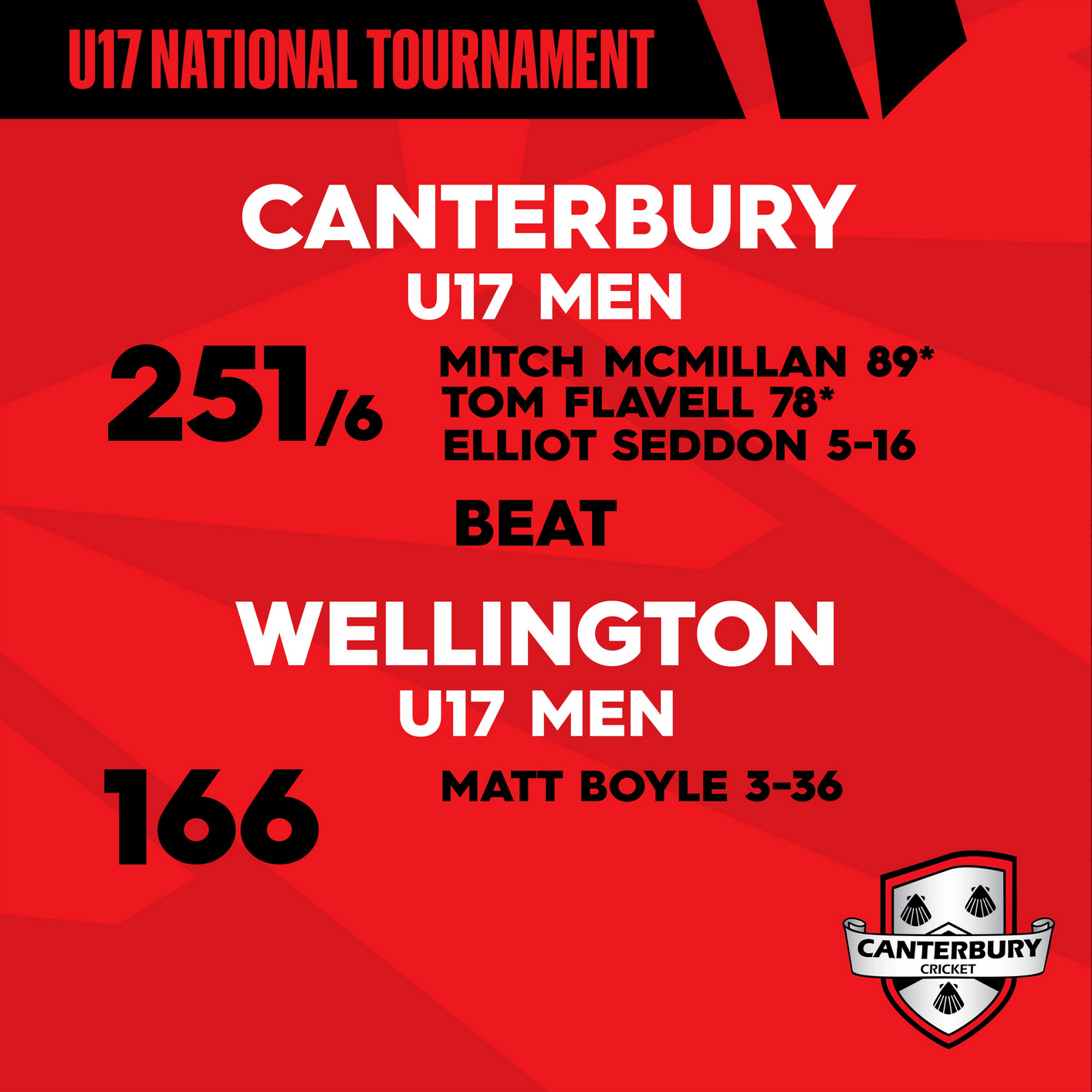 Canterbury Under-17 beat Wellington Under-17 by 85 runs