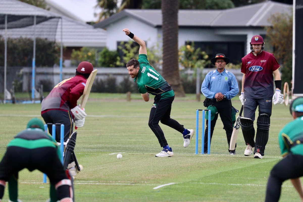 Blair Tickner bowls at Nelson Park as ND's Katene Clark and teammates watch on | MBUTCHER