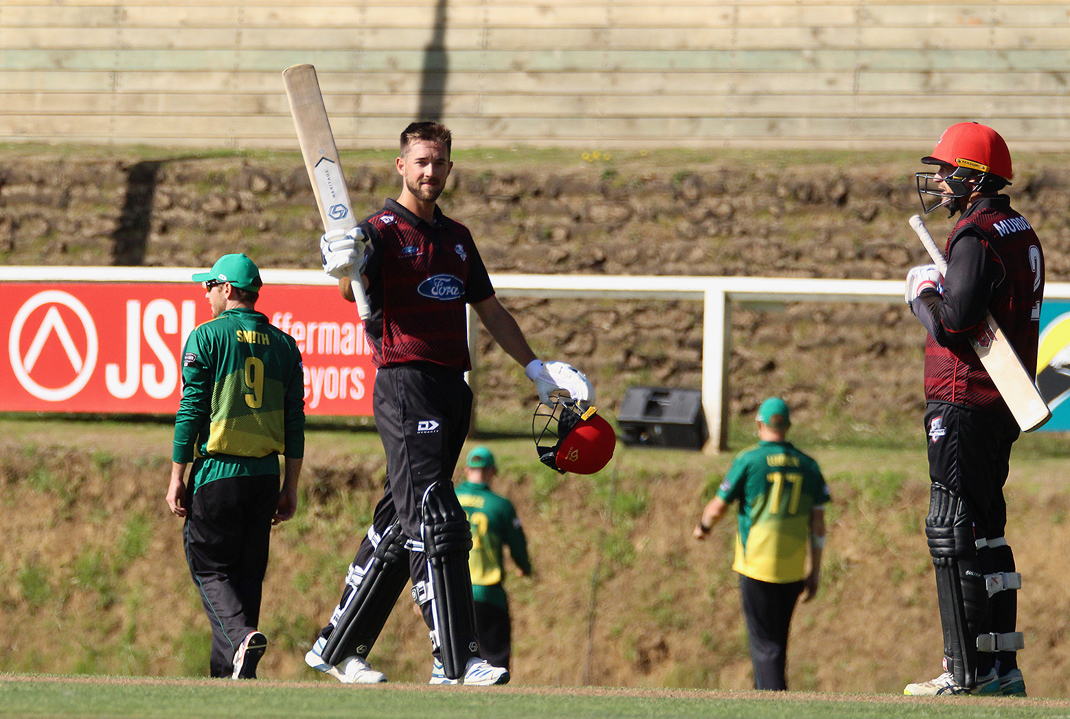 Stephen Murdoch congratulates Chad Bowes on reaching three figures | MBUTCHER